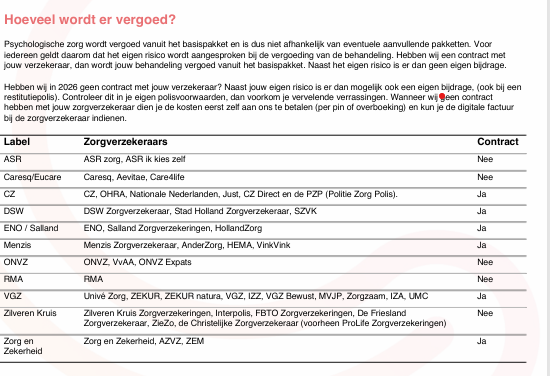 De zorg wordt meestal vergoed vanuit de basisverzekering van de Zorgverzekeringswet. Je krijgt de behandeling alleen vergoed als je een geldige verwijsbrief van je huisarts hebt. Ook moet er sprake zijn van een diagnose (DSM-5 classificatie) die onder de verzekerde zorg valt (dit wordt bepaald door het Zorginstituut Nederland).